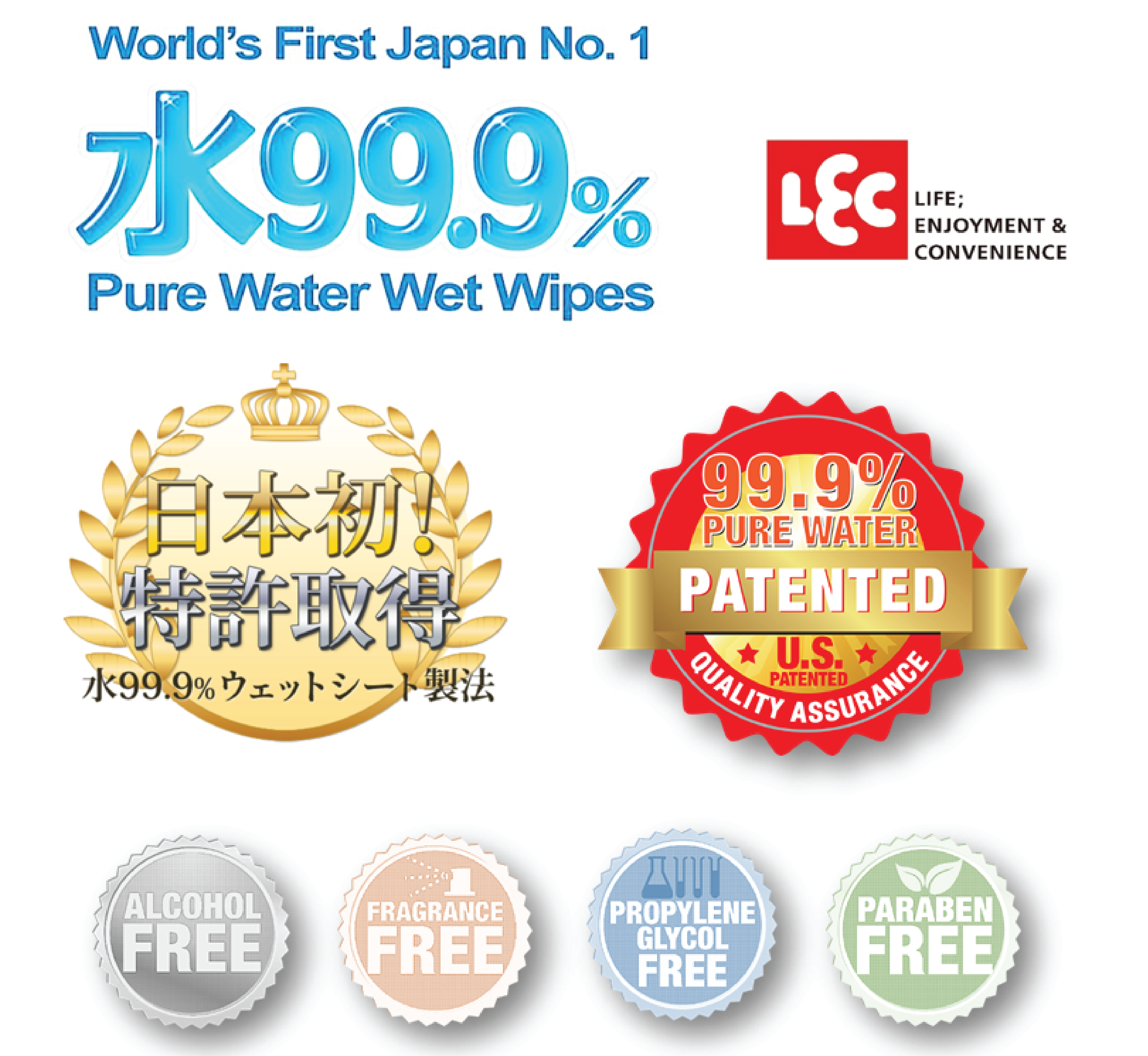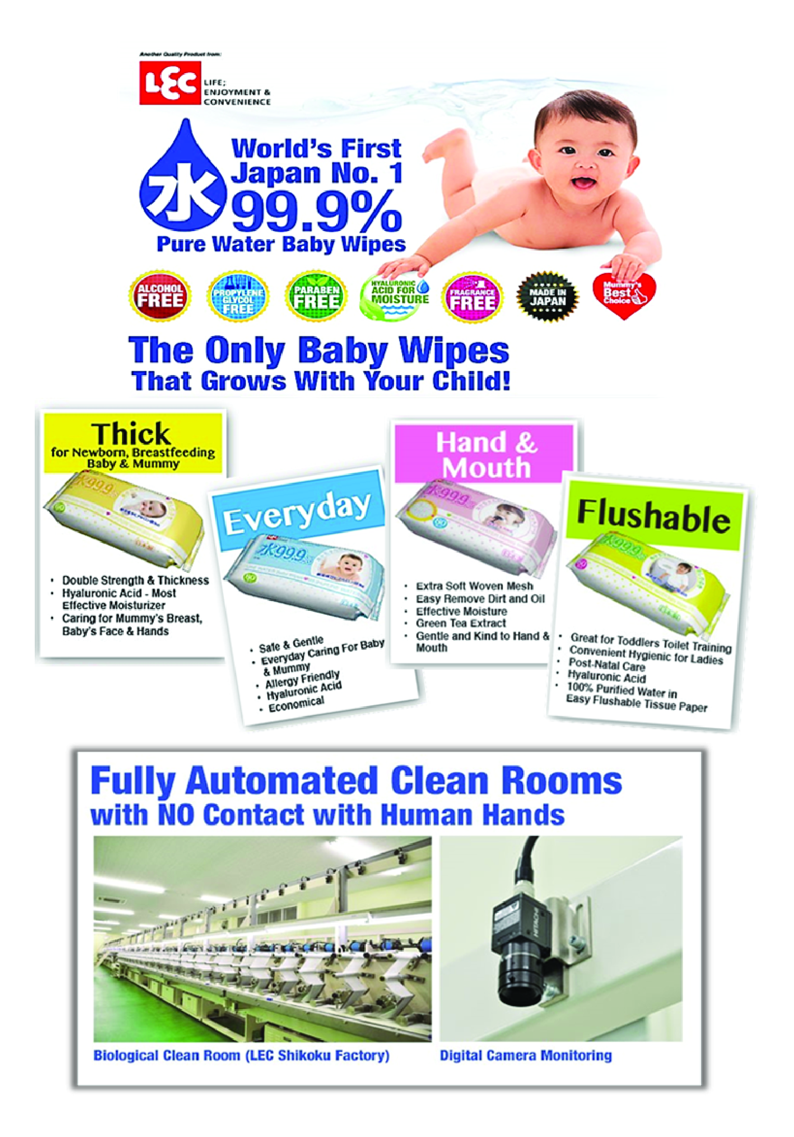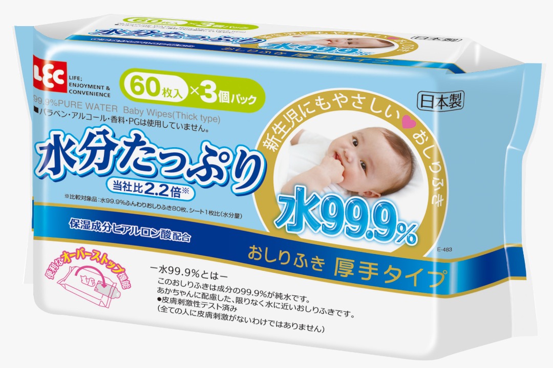 Baby skin's thickness is 1/2 of adults. Hence, to reduce the irritation on baby, it is best to use wipes that has the most water content. Compared to many other wipes in the market, LEC wipes are 99.9% water and 0.01% moisturiser, making it a top choice for parents to use on baby's delicate skin.